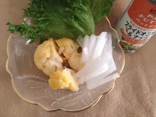 106日目サラダにパットフッテ 【106日目】 茹でカリフラワーと大根のサラダにパットフッテをかけて頂きました カリフラワー購入したの何年ぶりだろう笑