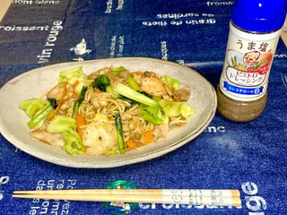 うま塩ドレッシングで、海鮮塩焼きそば 海鮮塩焼きそばを作りました🙌✨ 麺は、チルドコーナーにあるちゃんぽん麺を事前に油を入れて焼き目をつけておくことで食べ応えのある中太麺に♪(焼きそば麺でなく、ちゃんぽん麺が良いです👌) 具材には…豚肉、海老、あさり、長ねぎ、人参、キャベツ、小松菜を使用✨️味付けは【ピエトロドレッシ