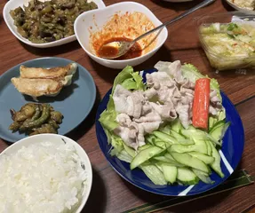 冷しゃぶ!ギョウザ!ゴーヤ 豚しゃぶ〜タレはコチュジャンを入れた甘辛ソースとピエトロの梅ドレッシングを追加して✌︎トマト🍅が無かったのでカニカマで彩りを(笑)2枚目はニラチヂミと沖縄のジューシー飯!ジューシーの素を使って作りました(^^)