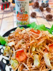 おうちパスタを使って、焼きそば♪ ごま醤油ガーリックは、万能すぎる笑焼きそばに使っても美味しすぎました!お肉は、鶏ハツです
