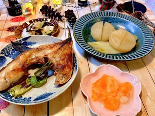 今日は珍しく和食 ブリカマが愛媛県産。養殖なのが残念ですが、ウマウマ。アラはブリ大根にし、軟白ネギと大根をいただきました。手前は大根おろしと柿の酢の物 胃に優しい大根オンパレードです