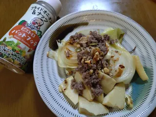 新玉ねぎとたけのこの肉みそのっけ焼き