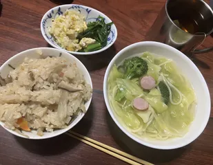 炊き込みご飯と野菜スープ 野菜スープ🥣✨身体にシミシミになるように作りました!炊き込みご飯も上手く炊き上がってくれて冬の美味しさ満点です💯最近ほうれん草にハマっています!美味しいドレッシングをかけて食べてます╰(*´︶`*)╯♡