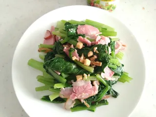【104日目】 小松菜とベーコンの炒め物にガーリックのパットフッテをかけていただきました ガーリックのパットフッテがよく合います