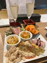 週末のしあわせごはん イタリアン居酒屋での一夜 日替わり前菜とスパークリング✨ 生ハムやキッシュ、キャロットラペ、パテ、白豆の和物、全部美味しかったです♡泡が進みました♪
