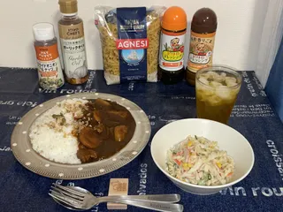 濃いカレー&マカロニサラダ 【57日目】各メーカー様が秋冬から出してきた新商品もスーパーや大型ショッピングセンターの食料品売場などで棚替で商品も並ぶこの頃♪ パスタコーナーやサラダコーナーでは、個食用の和風トマトガーリックソースや、新グリーンドレッシング&新パットフッテなども発売されましたね✨️お鍋コーナーの売場拡販