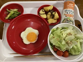 パットフッテチャレンジ37日目 【37日目】昨日の昼食はサラダにパットフッテをかけました!目玉焼きとアスパラベーコンには「ピエトロCHEF'S ガーリックオイル」を使いました!