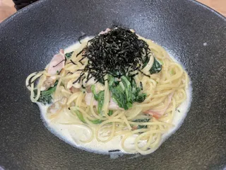 ランチ シーフードパスタと明太フランス ごま醤油ガーリックパスタソース間違いないですね。パットフッテのフライドオニオンガーリックで味に深みが増しました♪