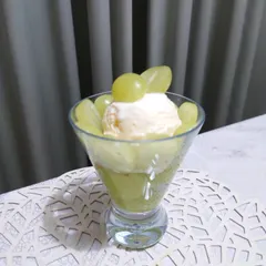食事後のデザート ベランダで初収穫したマイヤーレモンを使って、シャインマスカットゼリーを作りパフェにしました😋