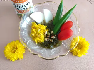 82日目めがぶの三杯酢 【82日目】 めがぶの三杯酢に今年初食用菊も添えてパットフッテをかけて頂きました