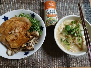 79日目 【79日目】豚ロース焼きと白菜と卵のスープに❣️ナッツフッテ🥜と再生豆苗🌱🤣をトッピング