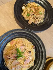 甘栗とベーコンのカルボナーラもお魚と舞茸のペペロンチーノ、どっちも食べたくて妹とシェア💕どっちも美味しかった😋