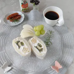 大好きなフルーツサンド 秋のフルーツサンドは、シャインマスカットですね😋梨とキウイ、プルーン、ナッツ、ベランダのローズマリーと一緒に盛り付けました😋💓 昨日投稿したのに、何故か?投稿になってなくてビックリでした😱