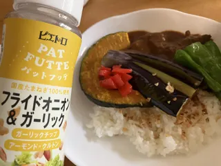 カレーライスに 【59日目】 カレーには素揚げした野菜をトッピングしたのでライスのほうにパットフッテを。