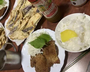 豚カツに梅ドレッシング〜 サッパリ意識の夏メニュー☀️豚カツに梅ドレと決めてシソを庭から摘んできてヒョイとのせました(^^)去年ピエトロさんの菜園部でナスを作ったのをいかして今年もコツコツとナスを作ってみました♡天ぷらにしました!見えてませんが、カボチャ🎃も買ってきてカボチャの天ぷらとゴーヤのかき揚げもしてみました!暑さ吹っ