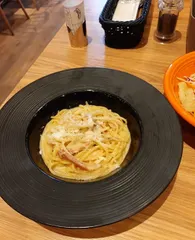 初ピエトロレストラン 初めてのピエトロレストランおかわりサラダを沢山食べたくてパスタはハーフにしました。カルボナーラが熱々で美味しくお腹いっぱいです!