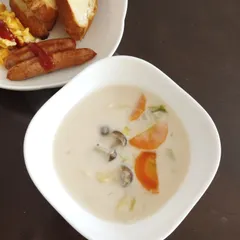 ミッション2アレンジ おうちにあったお野菜たち、 白菜.キャベツ🥬人参🥕きのこ🍄🟫を茹でて入れました。じゃがいも🥔やミックスビーンズ🫘もいいと思います。ミッション3しょうがのよい香りとクリーミーな香りでした。しょうがのピリッとした爽やかさもありつつ、クリーム系のマ