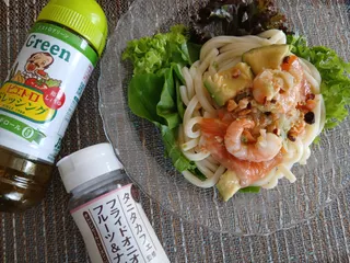 海老アボカドサラダうどん パスタを切らしていて、冷凍うどんで🙇♀️💦💦店員さんに食べ頃アボカド🥑を選んでもらいました❕(メンバーさんアドバイス✨)美味しかったー❣️大満足🥰
