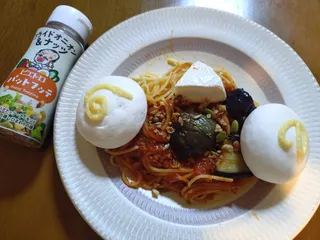 【63日目】なすとひき肉の辛味スパゲッティにパットフッテ 【63日目】盛り付け楽しみました😊
