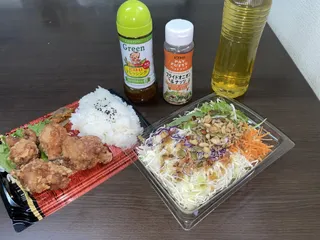 職場の休憩時間に✨ 【25日目】普段はなかなかお見せしたことない休憩時間のランチタイムを⸜🙌⸝ 鶏もも醤油唐揚げ弁当&キャベツサラダは私の部署(デリカ)の商品を買いました(*ˊᵕˋ*)サラダに、ドレッシングのグリーンとパットフッテをトッピング(*ˊᵕˋ*) 部署にも個食用ドレ