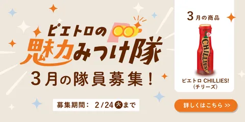 みなさま、こんにちは!ピエトロホームタウン案内人の“あやぽん”こと西田です🍫 本日は、「ピエトロの魅力みつけ隊」3月の隊員募集のお知らせです!👀 3月にみつけ隊員として活動してくれる方を募集します♪今回募集する「ピエトロの魅力みつけ隊👀」のターゲット商品は…ピエトロCHILLIE