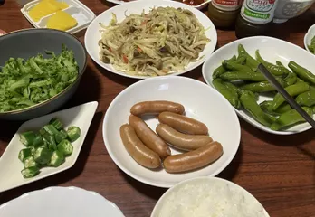 焼きうどん!野菜多め〜 オクラ、ゴーヤにドレッシング♬ピエトロドレッシング二本立てでした(^^)甘唐辛子を炒めたら食べたら唐辛子!辛くて食べれず罰ゲームみたいでした🤭野菜が多めの焼きうどんと茹でたウインナー!
