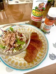 本日の朝食 【33日目】昨日のKITTE博多店の後、博多駅の構内へ♪ いっぴん通りで購入した三日月屋の紅茶クロワッサンとサラダにピエトロドレッシング和風しょうゆ&パットフッテ✨️ 最高の朝食ラインナップやね💕︎✨️ 一晩たったクロワッサンはトーストしてバターの香りを感じ