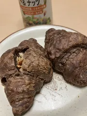 🥐チョコクロワッサン 【141日目】焼き上げたクロワッサン🥐を切り、食べやすいように中にパットフッテを入れました