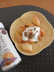 66日目 【66日目】焼きりんごに❣️クリームチーズを牛乳で伸ばしてソースにして、フルーツフッテをトッピングしました甘いものが止まらない…😱💧