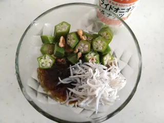 89日目酢の物 【89日目】 モズク酢としらす、オクラにパットフッテをかけていただきました