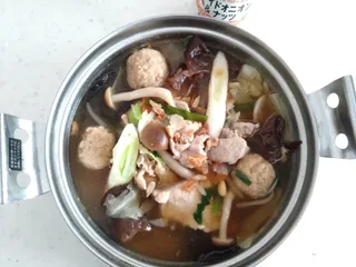 45日目塩ちゃんこ鍋 【45日目】 家にアルモンデ食材で塩チャンコ風鍋にパットフッテをかけて頂きましたパットフッテがいいアクセント