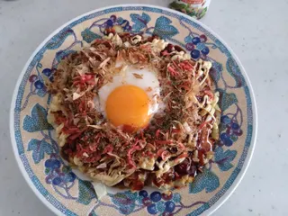 43日目お好み焼きに 【43日目】 会員さまから教えていただいたお好み焼きにパットフッテをかけ、たべながらかけていただきました食べながらかけて食べるスタイルもいいですね、教えていただきありがとうございました
