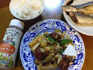 【47日目】肉団子黒酢あん入り野菜いろいろ炒めにパットフッテ 【47日目】黒酢あん肉だんごにはパットフッテが合うと思って振りました。
