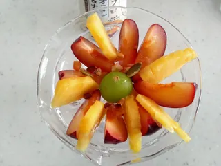 42日目初フルーツ&ナッツ 【42日目】 初めてフルーツ&ナッツを使用しました甘いものに合うと教えていただいたのでプラム、パイナップル、シャインマスカット、生はちみつにフルーツ&ナッツのパットフッテをかけましたとってもおいしかったです