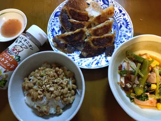 【45日目】納豆にパットフッテ 【45日目】皆さん振ってるので、試してみました😊納豆の下にしらすが埋もれてます。餃子のタレはうめドレッシングです