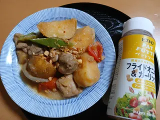 48日目 【48日目】料理番組(3分の…笑)で観た肉じゃがに❣️鶏肉とミニトマト🍅オクラが入りますフライドオニオンで美味しさアップ🥰