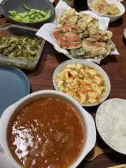 麻婆豆腐♬ 週末の冷蔵庫使い切り日!カニカマとチクワの天ぷらにオマケにナスとピーマン🍆🫑✨麻婆豆腐とミネストローネ、ゴーヤの酢の物。赤色が多かった食事でした(o^^o)