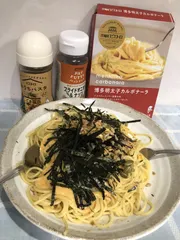 博多明太子カルボナーラ 【6日目】博多明太子カルボナーラと山盛りの海苔とパットフッテ明太子系のソースは海苔トッピングが好みです。