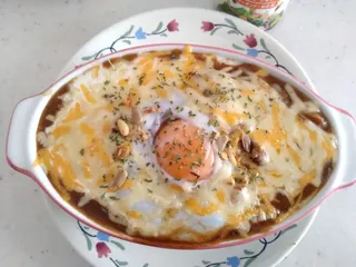 朝から食欲そそる画像😋 カレードリア、食べたいなぁ。真ん中に卵入ってるし。美味しそうです。