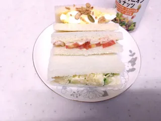 87日目サンドイッチ 【87日目】 3種類のサンドイッチを作りましたたまごサラダにパットフッテをかけて頂きました