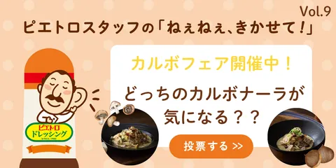 カルボフェア開催中!どっちのカルボナーラが気になる? みなさま、こんにちは!ピエトロホームタウン町長の五十畑(いかばた)です。 先月も「ピエトロスタッフのねぇねぇ、きかせて!」にご参加いただきありがとうございました✨️パットフッテはフライドオニオン&ナッツのほうが人気ですね😄パットフッテは9月1日からリニューアルしてさらにパワーアップしていま