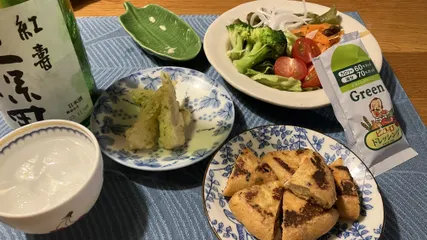 筍とサラダにピエトログリーン 桜も咲いて花見かえりの宅飲みは、旬の穂先天とじゃこ山椒に焼きがんも、サラダはピエトログリーン。