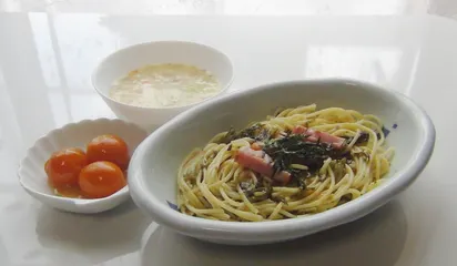 高菜とベーコンのパスタセット ピエトロの「高菜とベーコン」のパスタに、参鶏湯風スープ、きんかん煮のセットです。ピエトロレストランが近くにないので、実際のセットは食べたことがないのですが…💦