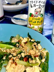 休日の朝食に✨٩(๑´0`๑)۶ のこベジファームのロメインレタスでガーリックオイルやピエトロドレッシングで炒め合わせたものを朝食のおかずに♪卵を炒めるガーリックオイルを😊卵を炒めるガーリックオイルは気持ち少し多めにしつつ、しっかり加熱されたところで卵を入れ...強火でサッとガーリックオイ