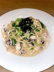 グランドメニューのリニューアルに伴い…和PASTAメニューにある【たらこ】を【たらこクリーム】に変更できるようになりこちらも早速お試ししました🤗✨️ 3種類のシーフード&ほうれん草をトッピングし贅沢なたらこクリームパスタで味わいました🤗✨️たらこの旨味&コクのあるクリームソース