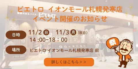 『ピエトロ イオンモール札幌発寒店』イベント開催のお知らせ! みなさま、こんにちは!ピエトロホームタウン 案内人の西田です😊本日は、「ピエトロイオンモール札幌発寒店」で開催するイベントのお知らせです! 11月2日(日)と3日(月・祝)の2日間、「ピエトロ イオンモール札幌発寒店」の店頭でイベントを開催します! 当日はおたのしみが盛りだくさん