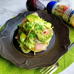 アボカドを潰したものに豆乳を加え火にかけ湯掻いたパスタを投入。最後に火を消してうま塩ドレッシングで混ぜます。器に盛り付ける時、別で軽くうま塩ドレッシングで和えていたアボカドと生ハムと一緒に盛り付け、最後にブラックペッパーをかけてできあがり。ちょっと豆乳が少なかったみたいでして💦うま塩ドレッシング玉ね