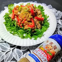 先にドレッシングだけ味見しました。私の好きな味です😍【豚肉と玉ねぎのうま塩炒め】豚肉と玉ねぎに合うのではないかと思い、調味料として使用しました。ごま油で豚肉、玉ねぎ、赤パプリカを炒め、そこにきざみねぎとうま塩を加えて最後にブラックペッパーをかけてできあがりです。玉ねぎをよく炒めたので甘味が出たため、