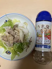 キャベツをやや太めに切り、うま塩ドレッシングをかけ20分置き、味を染みこませていただきました。