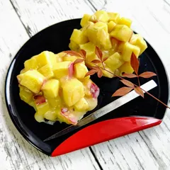 さつまいもの🍠はちみつレモン煮 レモン汁とはちみつで🍠さつまいもを煮含めました。冷蔵庫で冷やしてパットフッテ で、おめかし🎵 湿度が高い日にさわやかな甘さのおやつです☺️
